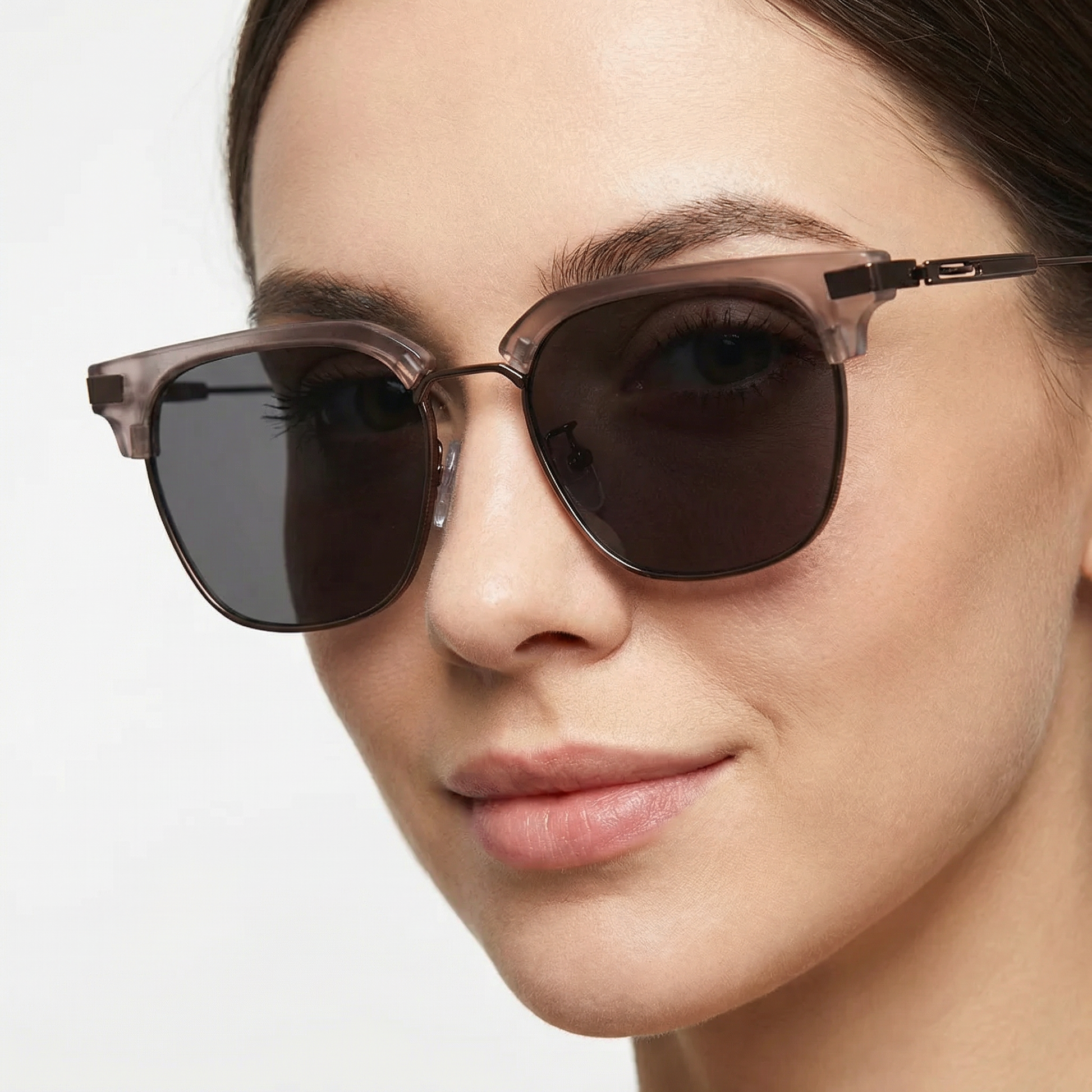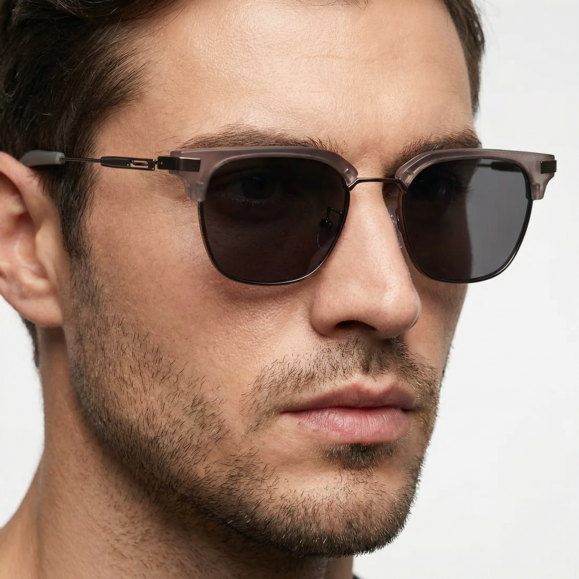 Description-Bold clubmaster frames by Shadygators featuring a classic smoke grey brow line and metallic lower rims.