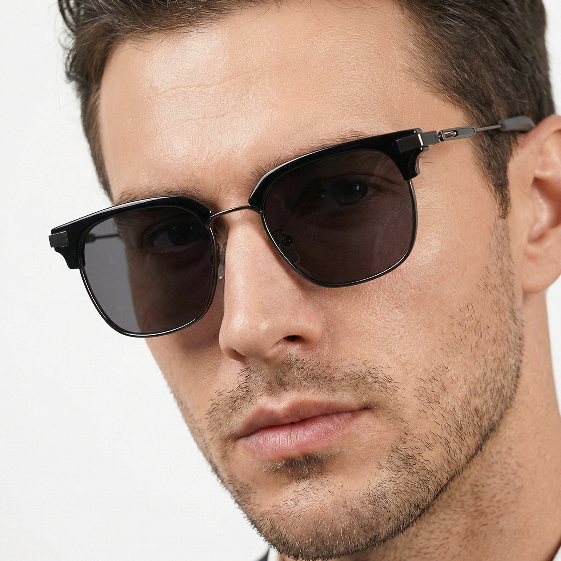 Description-Bold clubmaster frames by Shadygators featuring a classic midnight black brow line and metallic lower rims.